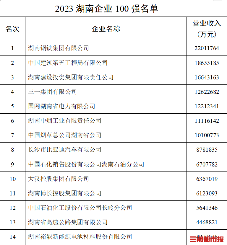 2023湖南制造業(yè)企業(yè)100強(qiáng)名單中,湖南鋼鐵集團(tuán)有限公司、三一集團(tuán)有限公司、湖南中煙工業(yè)有限責(zé)任公司居前三名,后兩家公司的營(yíng)收分別為1262億元和1112億元。在2023湖南服務(wù)業(yè)企業(yè)50強(qiáng)名單中,國網(wǎng)湖南省電力有限公司、中國煙草總公司湖南省公司、中國石化銷售股份有限公司湖南石油分公司分別以1221億元、1010億元、670億元的營(yíng)收排名前三。